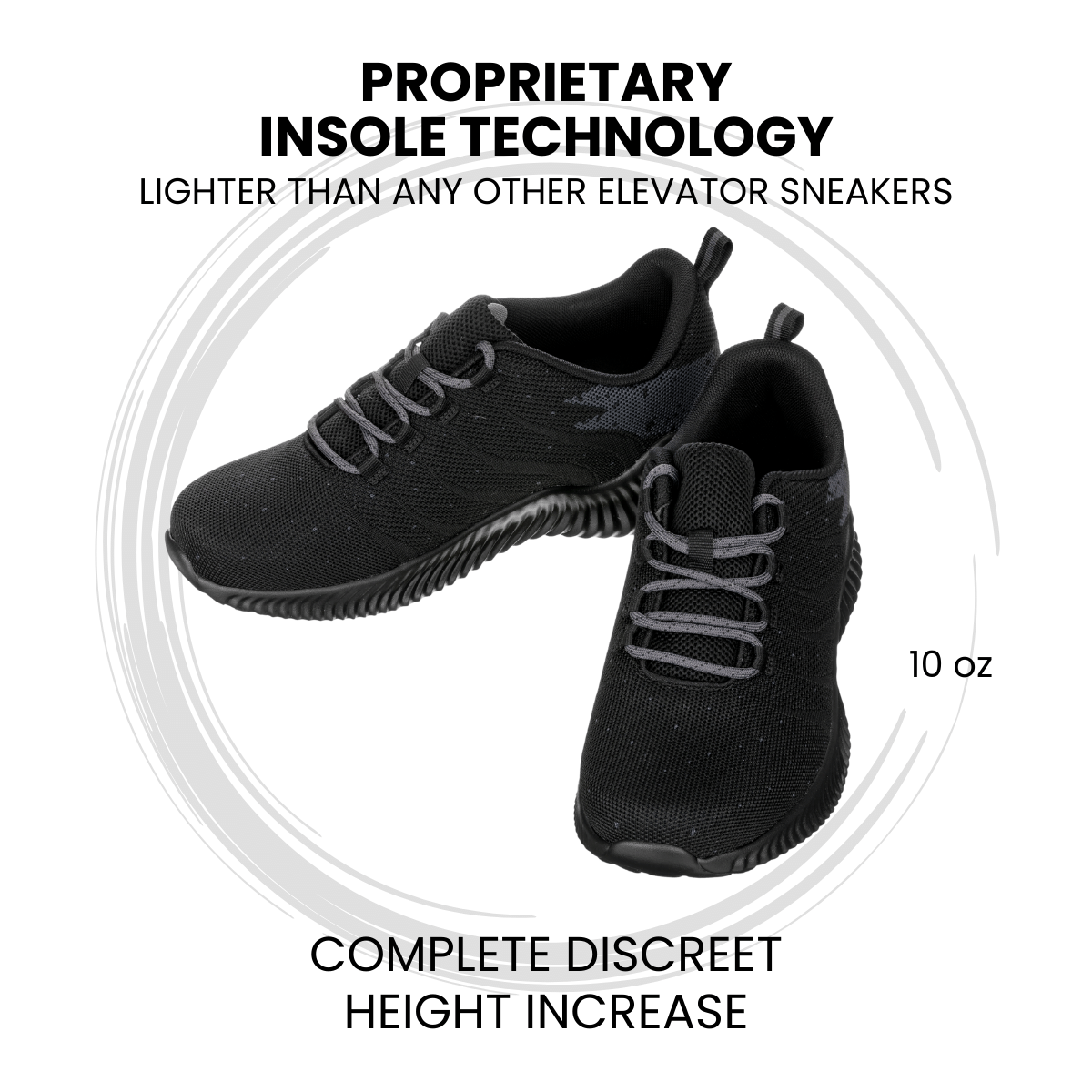 These men's elevator sneakers in classic black and grey are constructed from a breathable knit upper that's double stitched for good looks and durability. With their unique design, these elevator athletic shoes add height seamlessly, making you appear taller. They feature traditional lace-up fastening for a secure fit, and the slip-on design with pull tab provides easy wearability. They don't look like sneakers to make you taller - they just look like a great pair of athletic shoes.